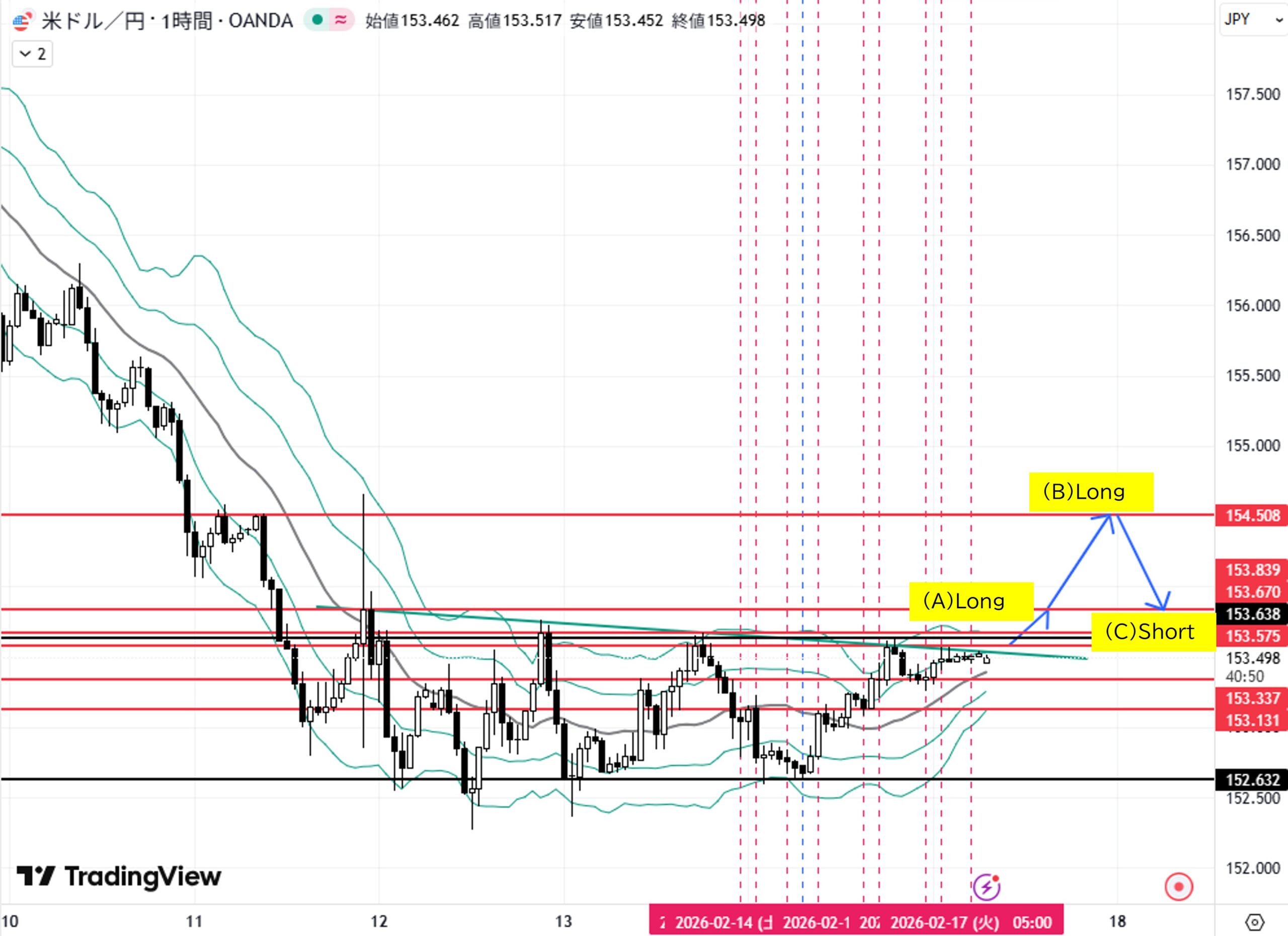 (C)1H足戻り高値154.508付近へ上昇→転換下落→目標1H足戻り高値153.839