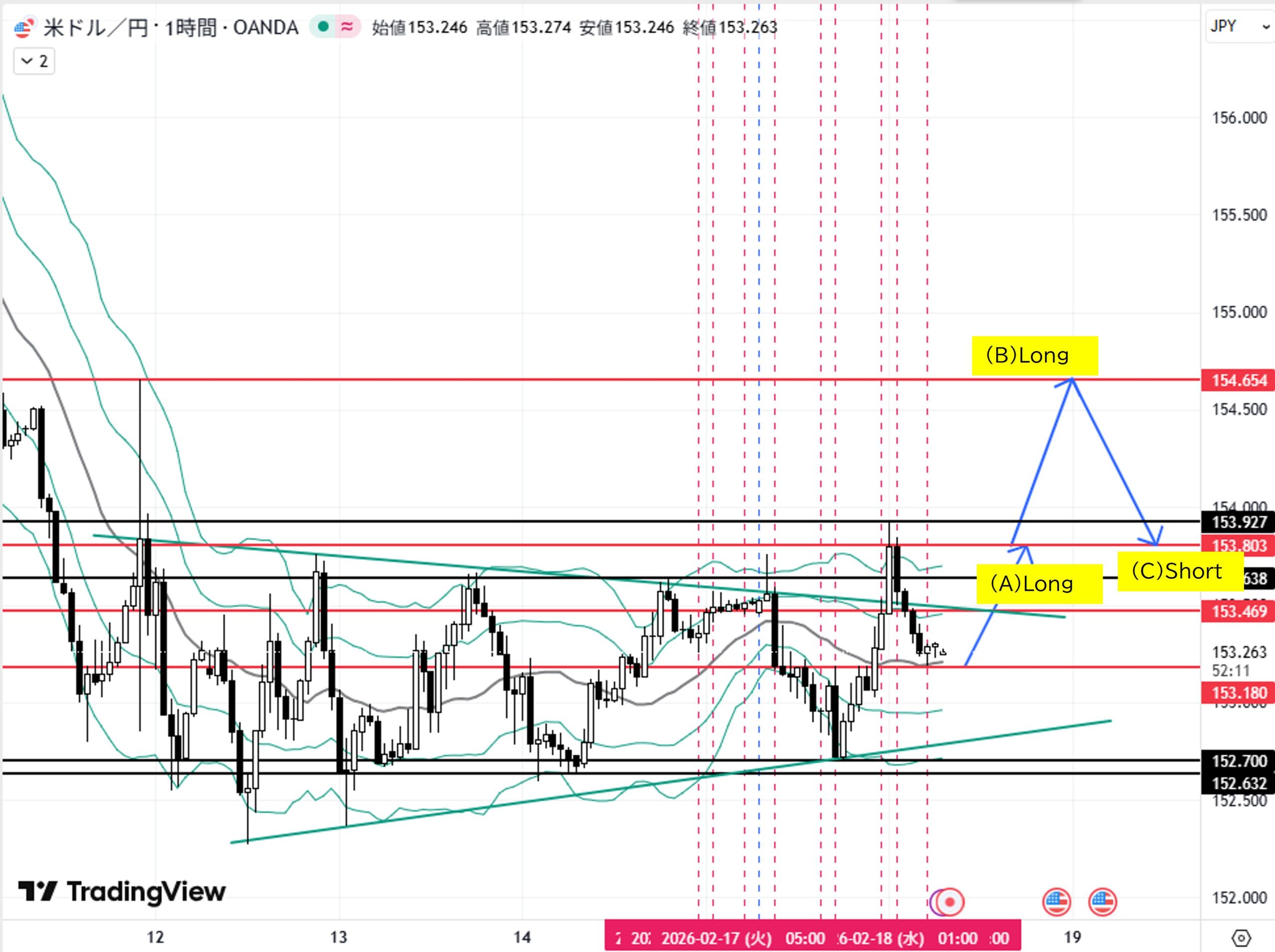 (A)1H足戻り高値153.180付近へ下落→転換上昇→目標1H足レンジ高値153.803