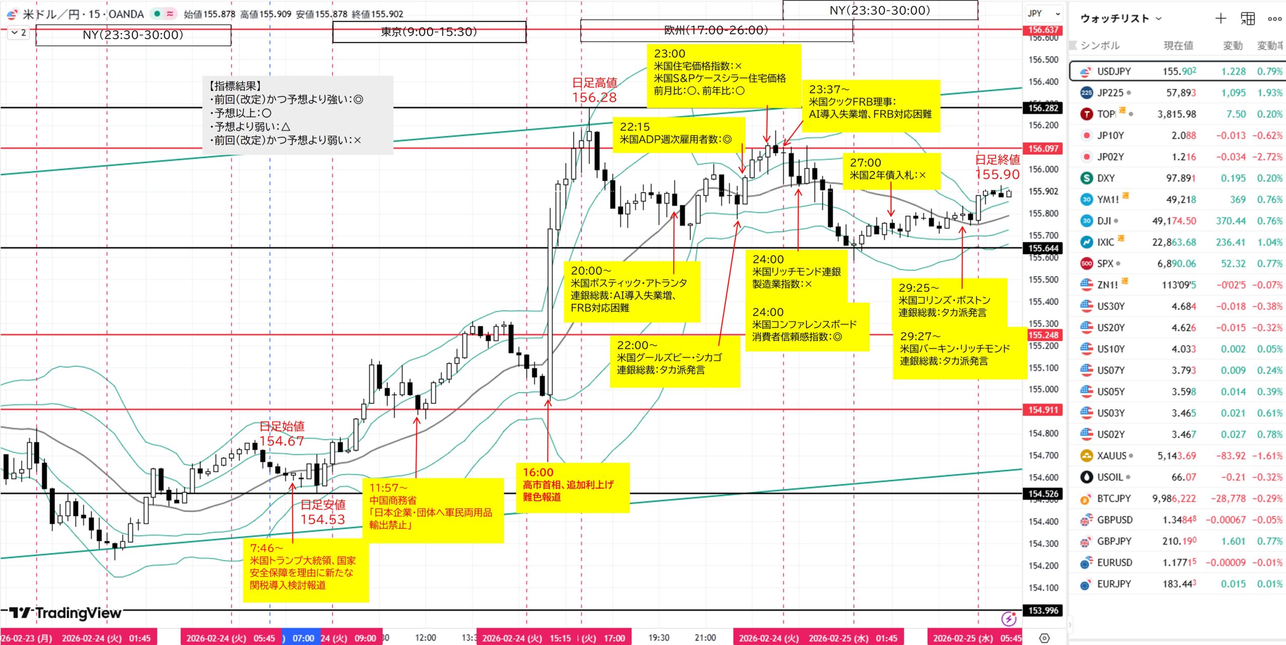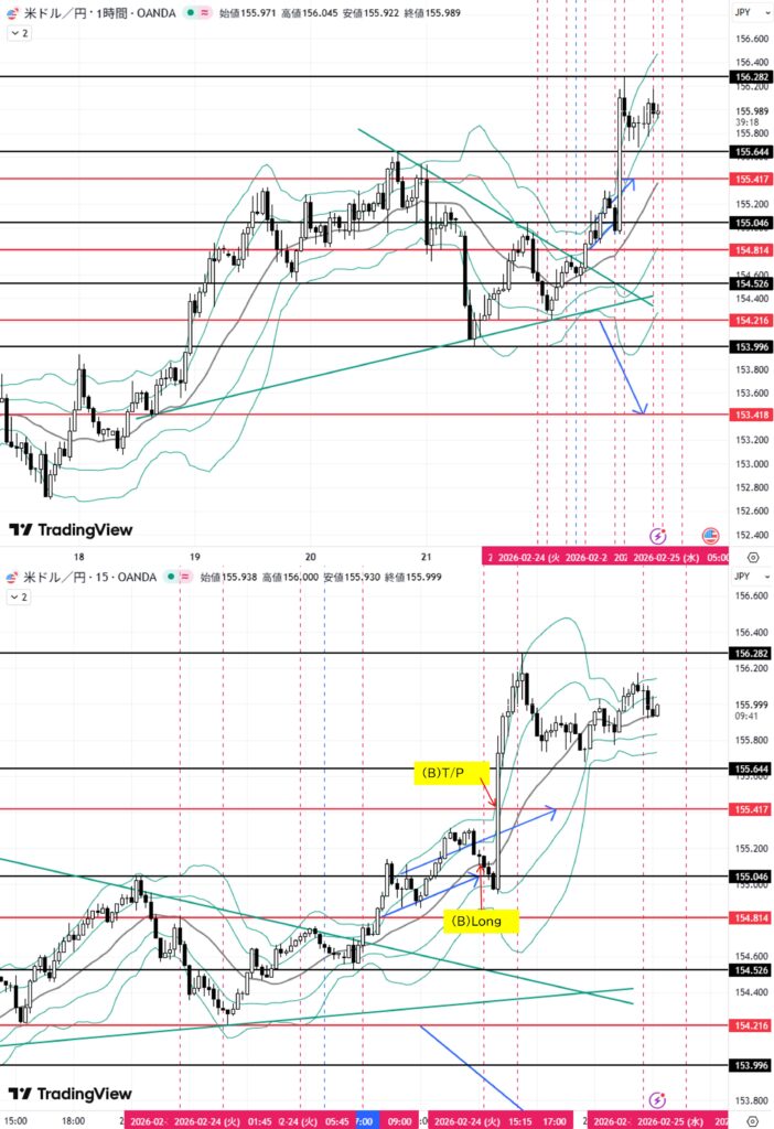 (B)日足高値155.046をダウ上昇→目標1H足戻り高値155.417