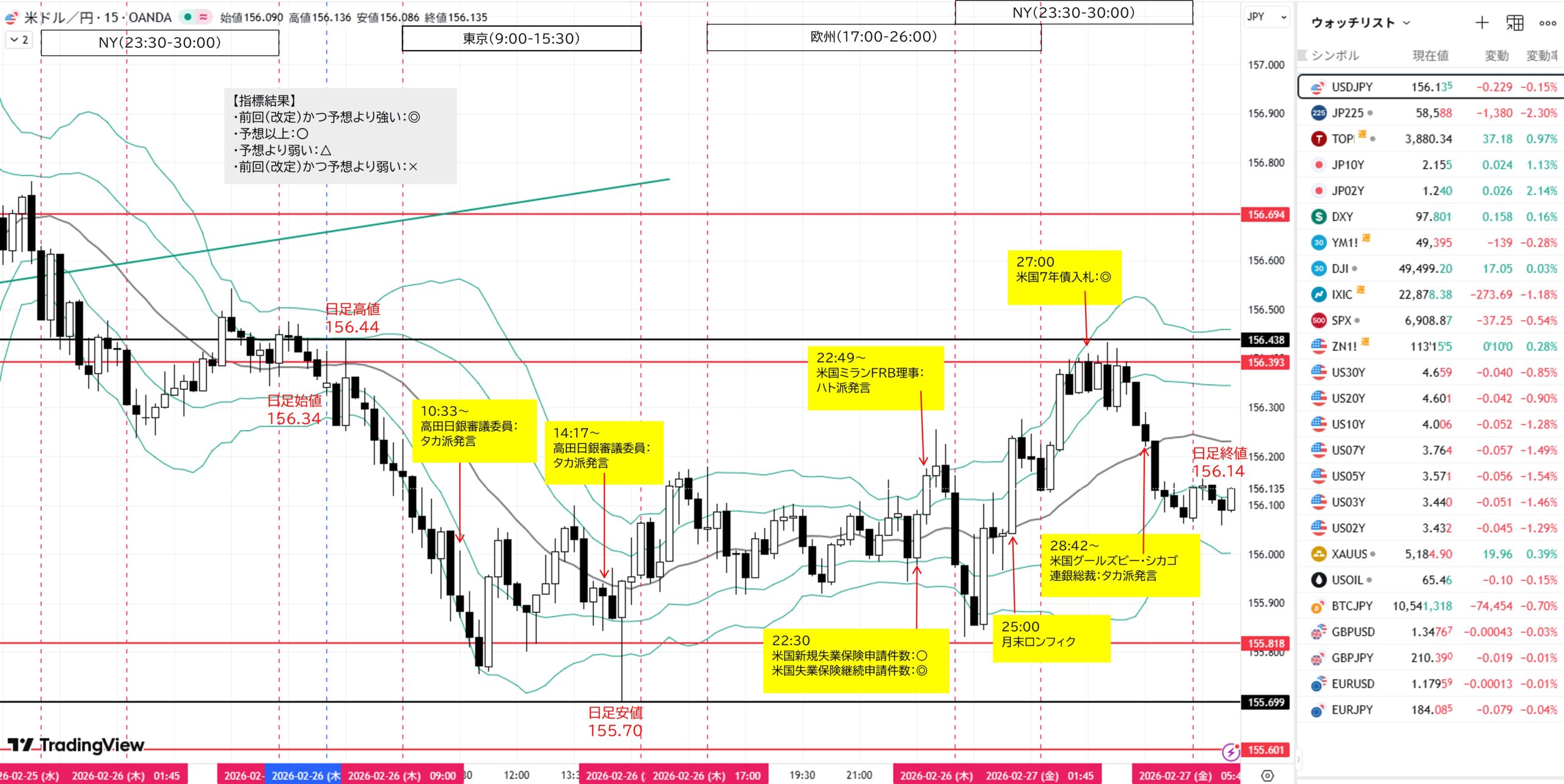 (C)1H足レンジ安値156.285をダウ下落→目標4H足押し安値155.598