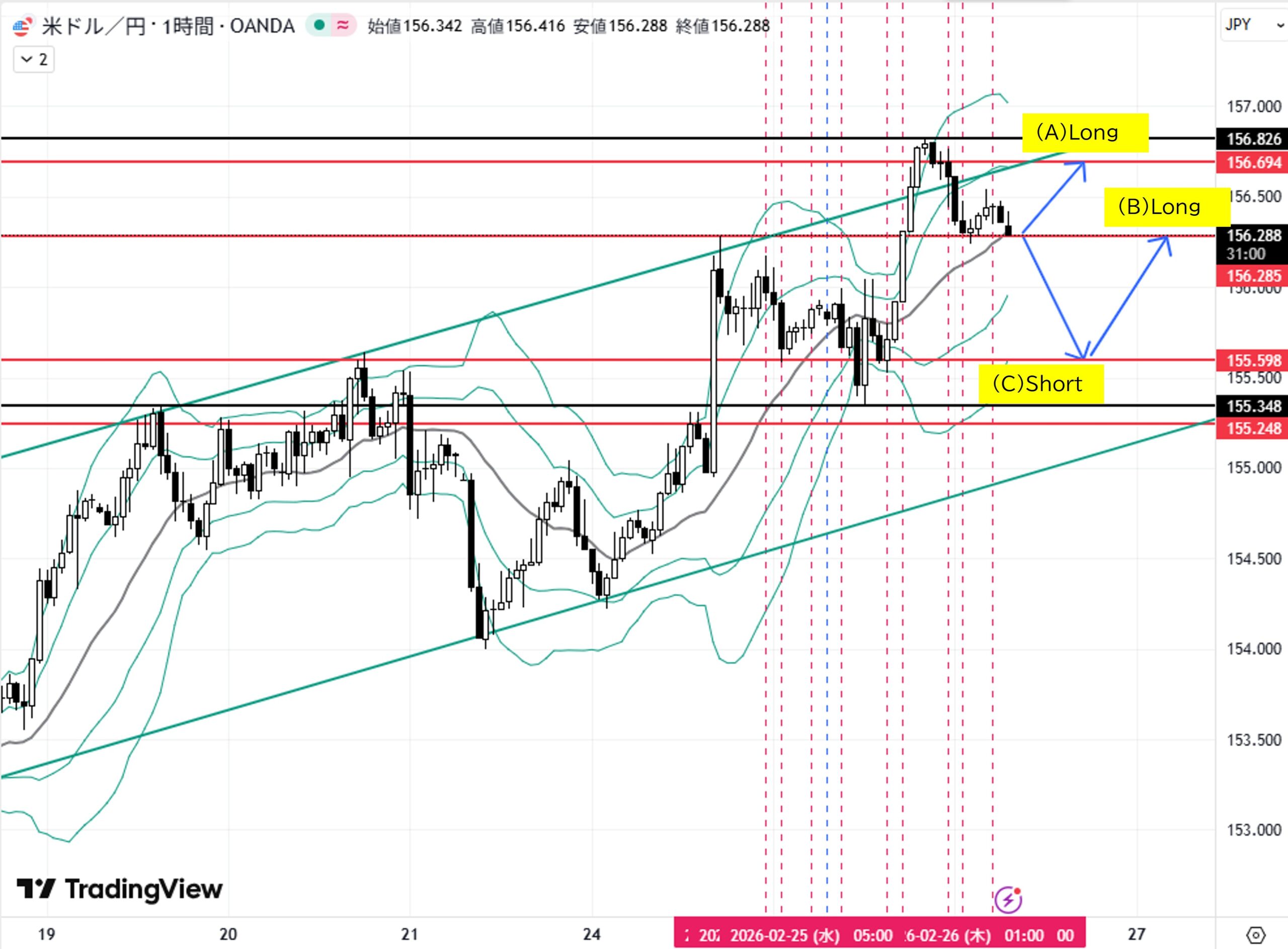 (A)1H足レンジ安値156.285付近へ下落→転換上昇→目標4H足ダウ高値156.694