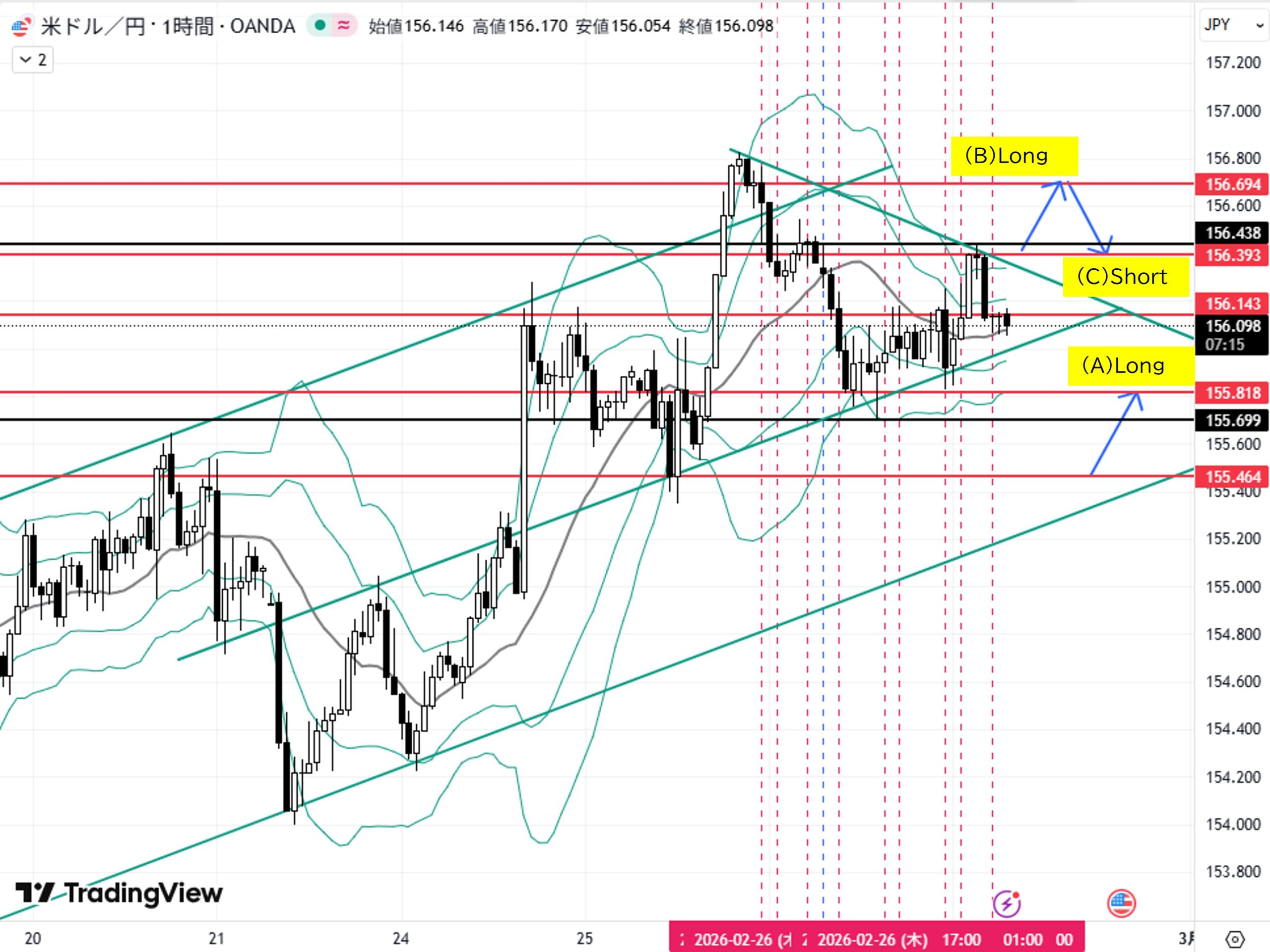 (B)1H足レンジ高値156.393をダウ上昇→目標4H足レンジ高値156.694