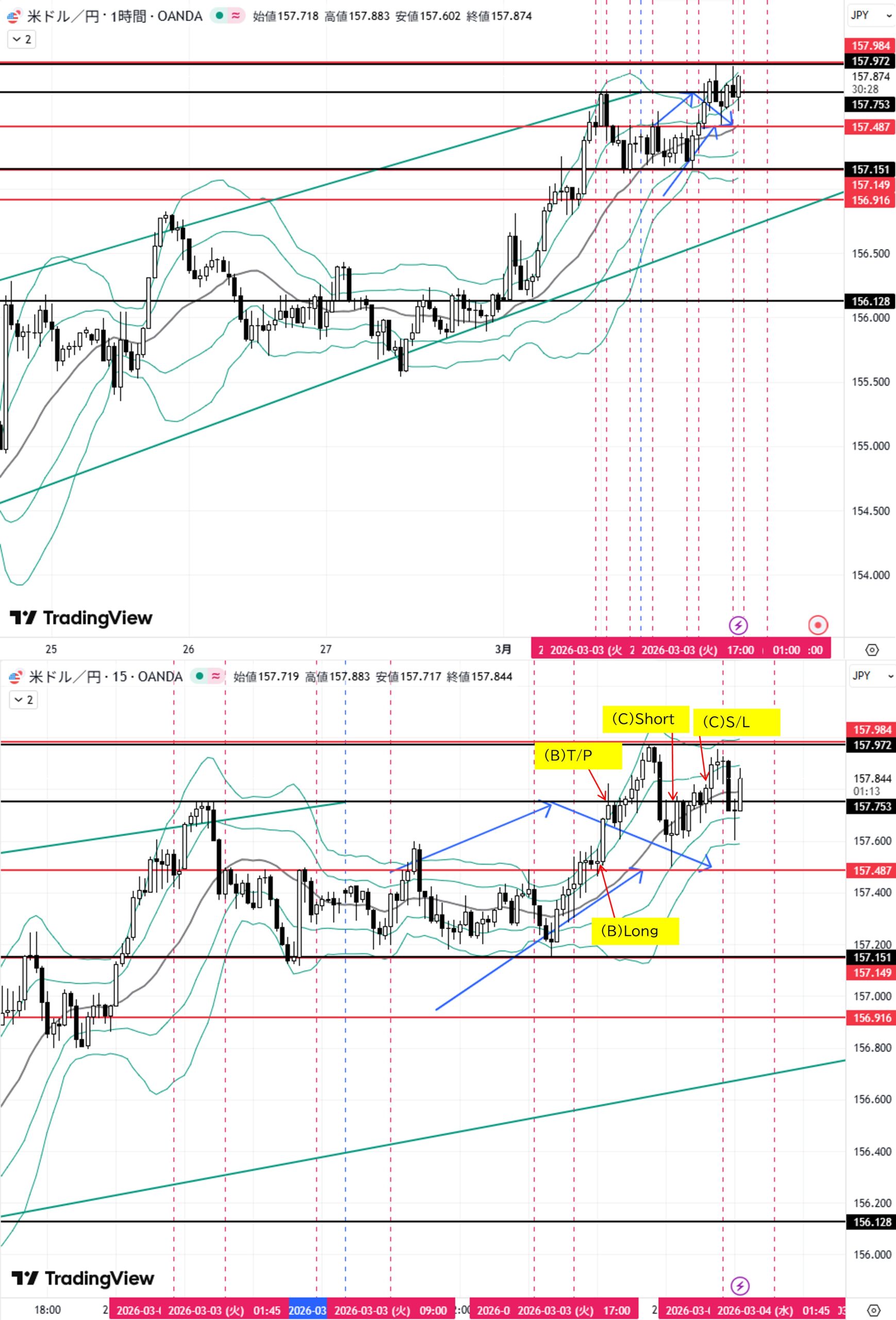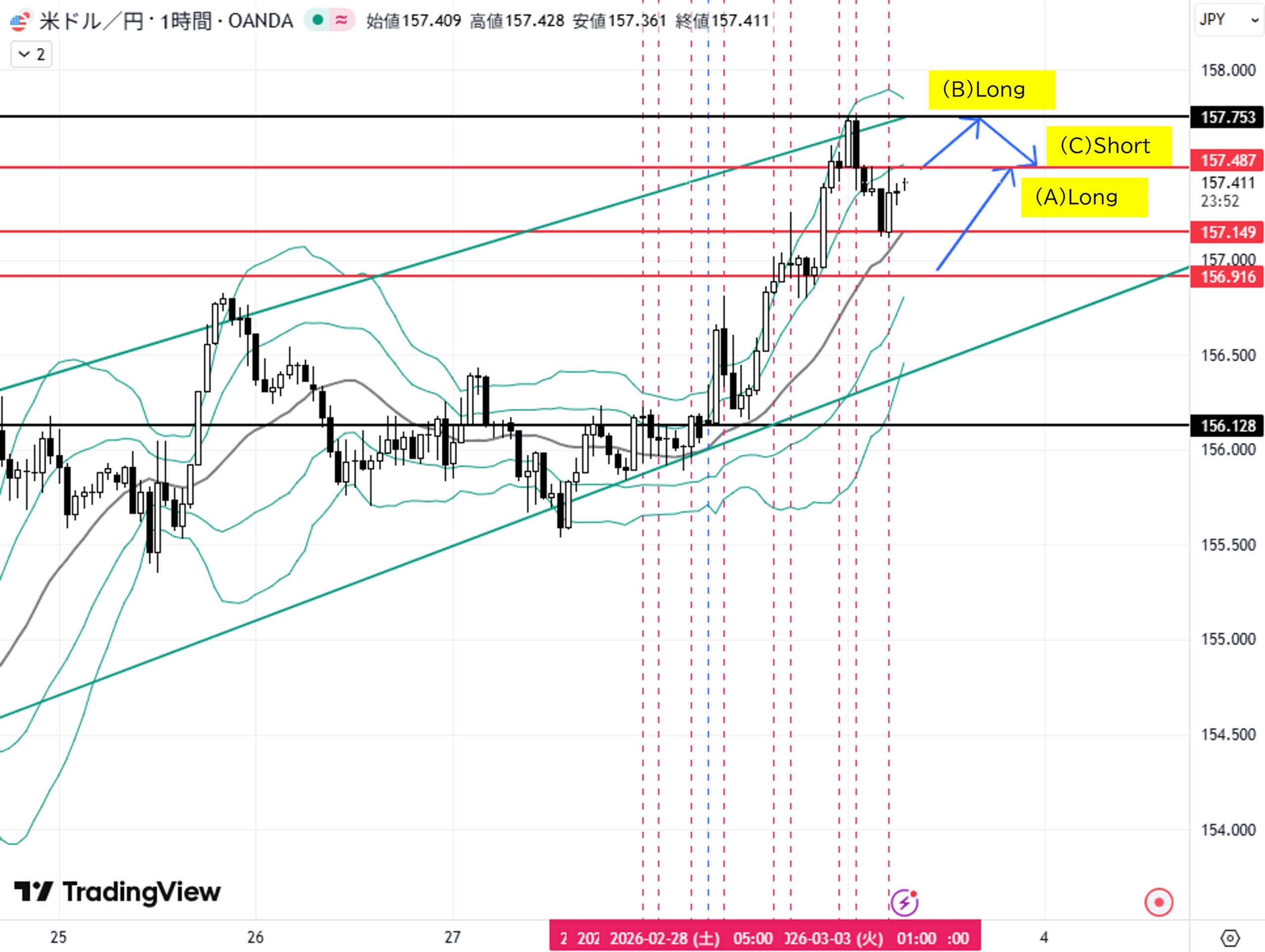 (C)日足高値157.753付近へ上昇→転換下落→目標1H足押し安値157.487