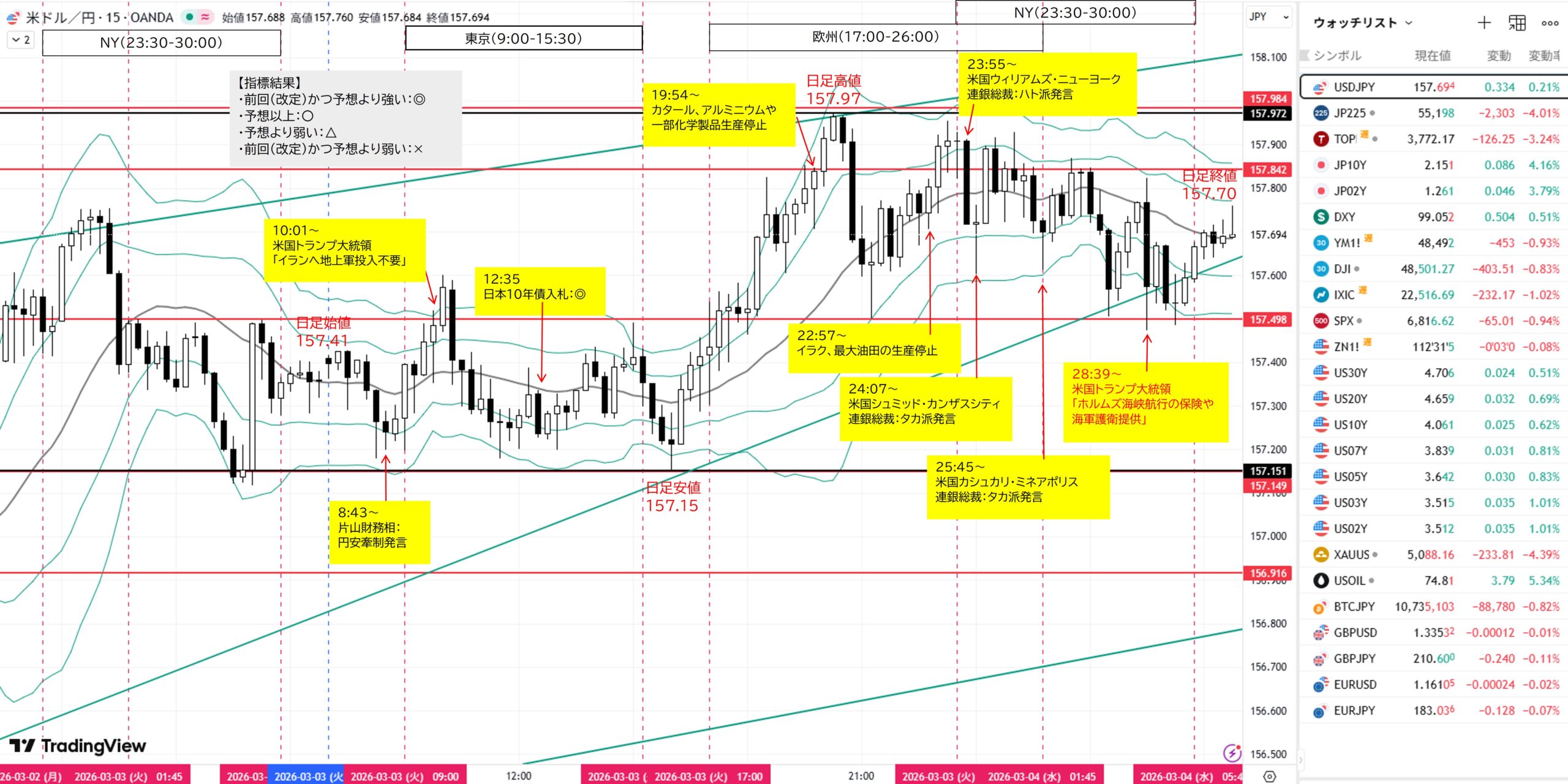 (B)1H足押し安値157.487をダウ上昇→目標日足高値157.753