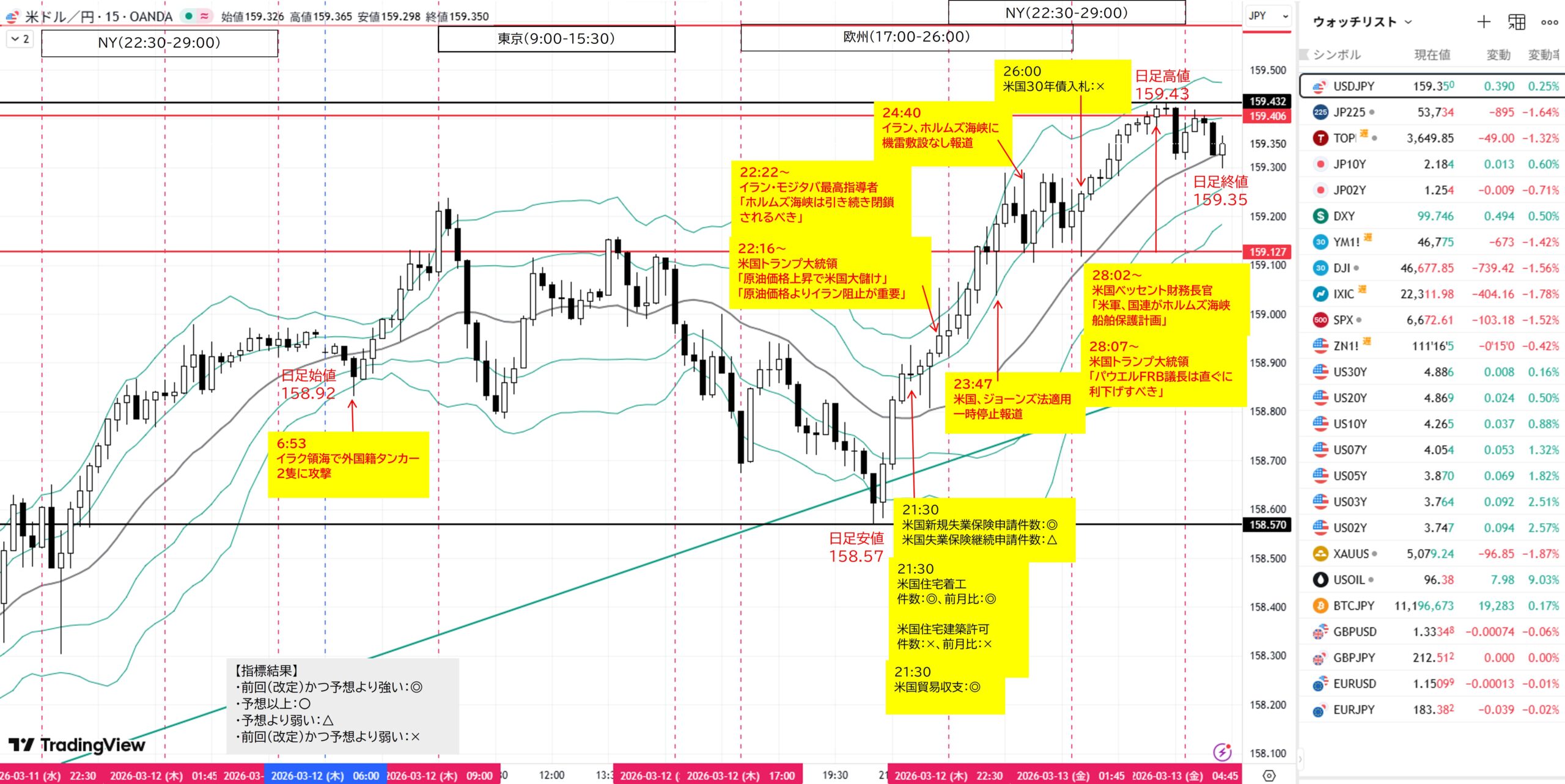 (C)日足レンジ高値159.228付近へ上昇→転換下落→目標1H足ダウ高値158.960
