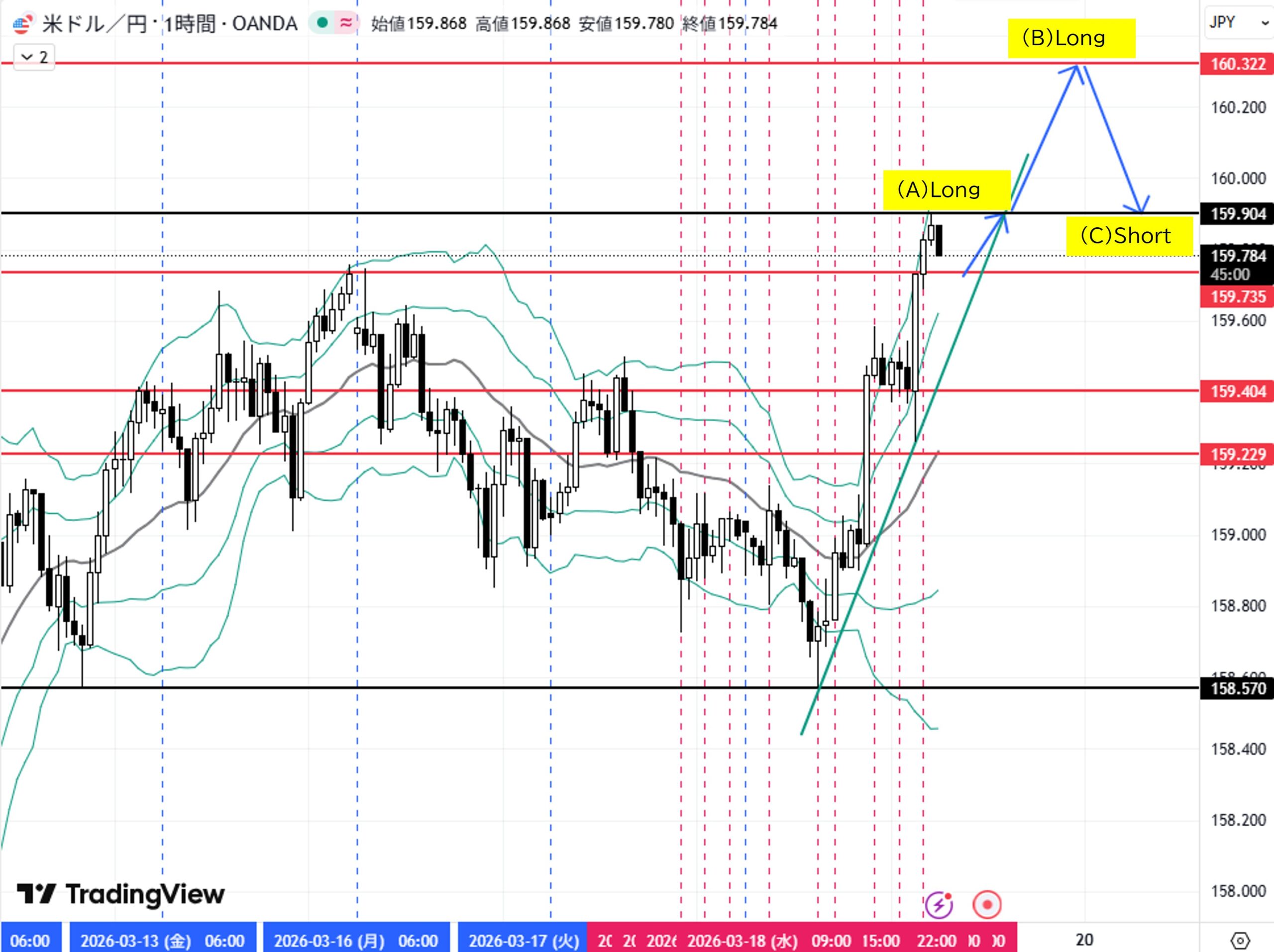 (A)1H足レンジ高値159.735付近へ下落→転換上昇→目標日足高値159.904
