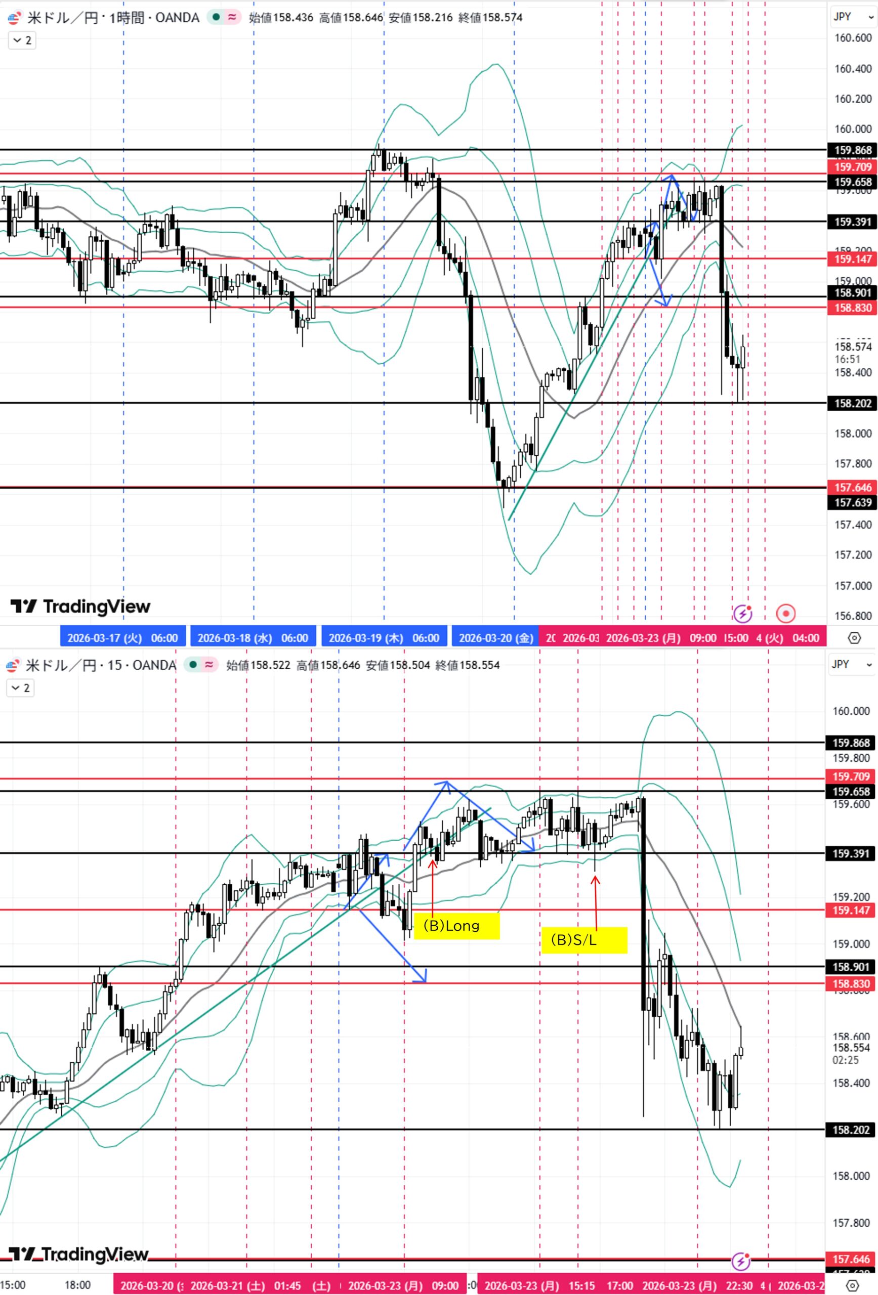 (D) (A)後、1H足押し安値159.147をダウ下落→目標1H足ダウ高値158.830