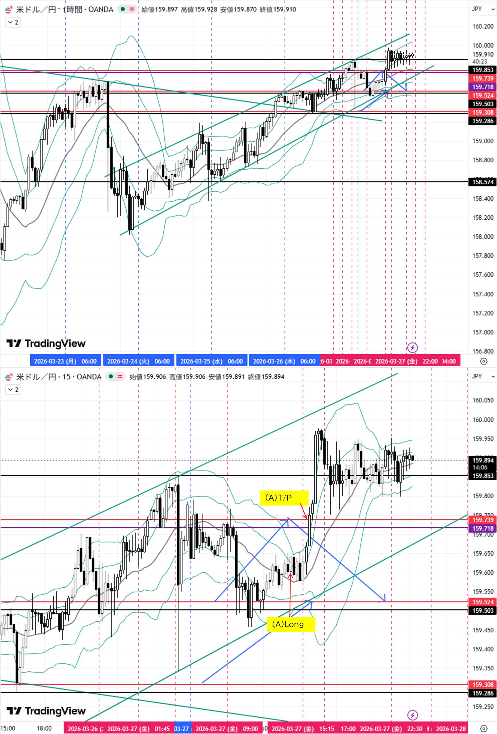 (A)1H足押し安値159.524付近へ下落→転換上昇→目標1H足押し安値159.739