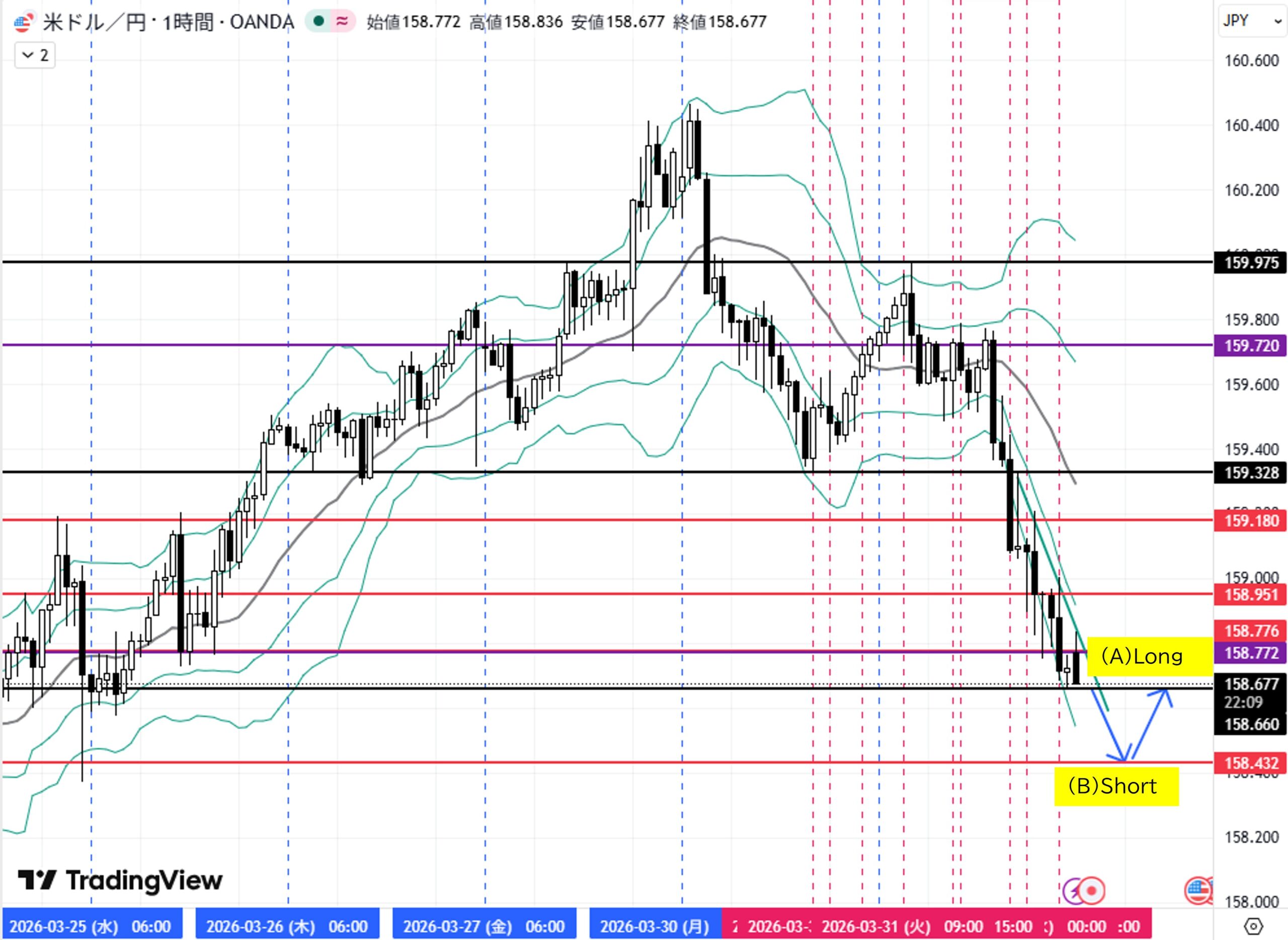 (B)日足安値158.677をダウ下落→目標1H足押し安値158.432