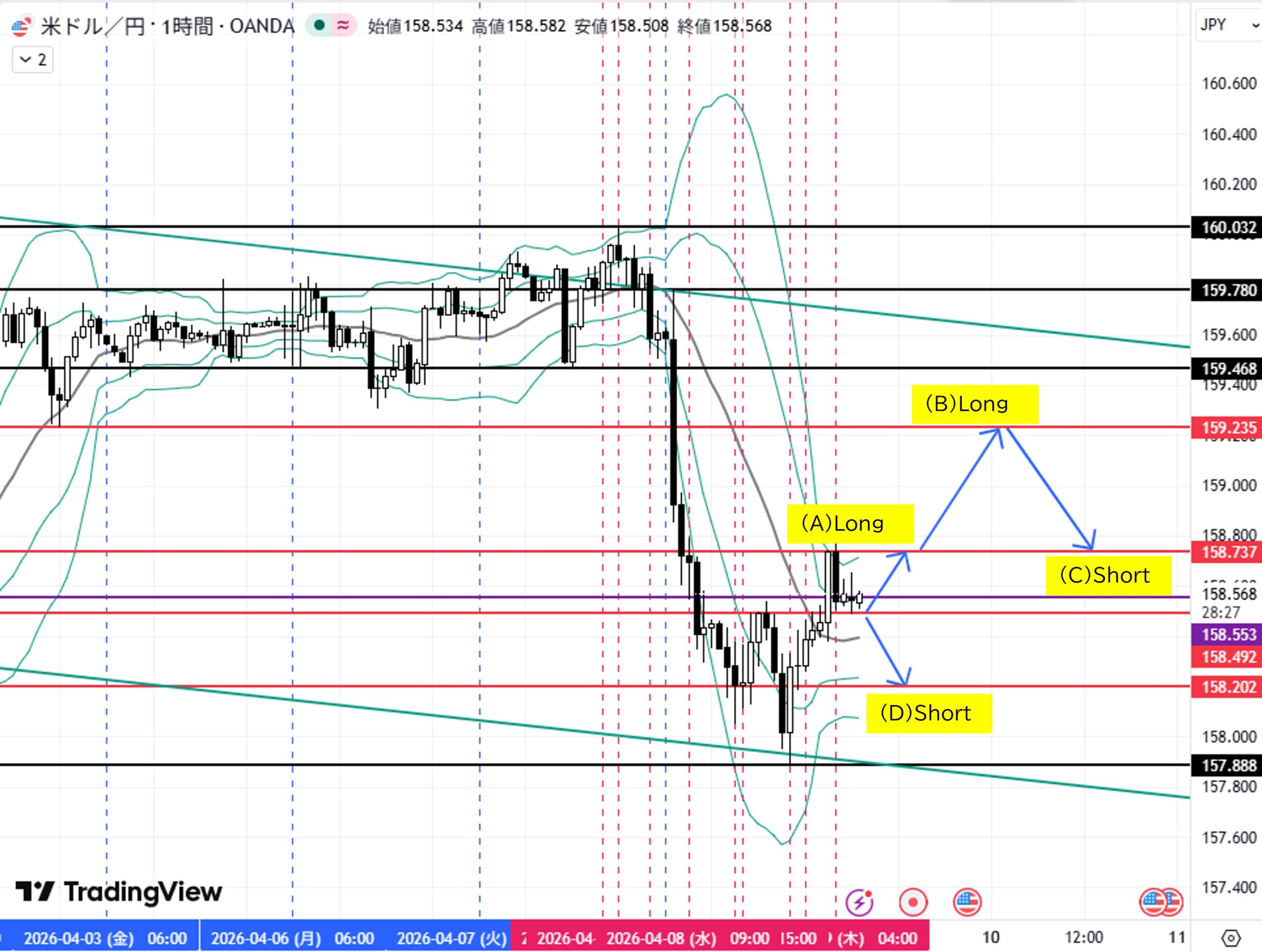 (A)1H足戻り高値158.492付近へ下落→転換上昇→目標1Hダウ足高値158.737