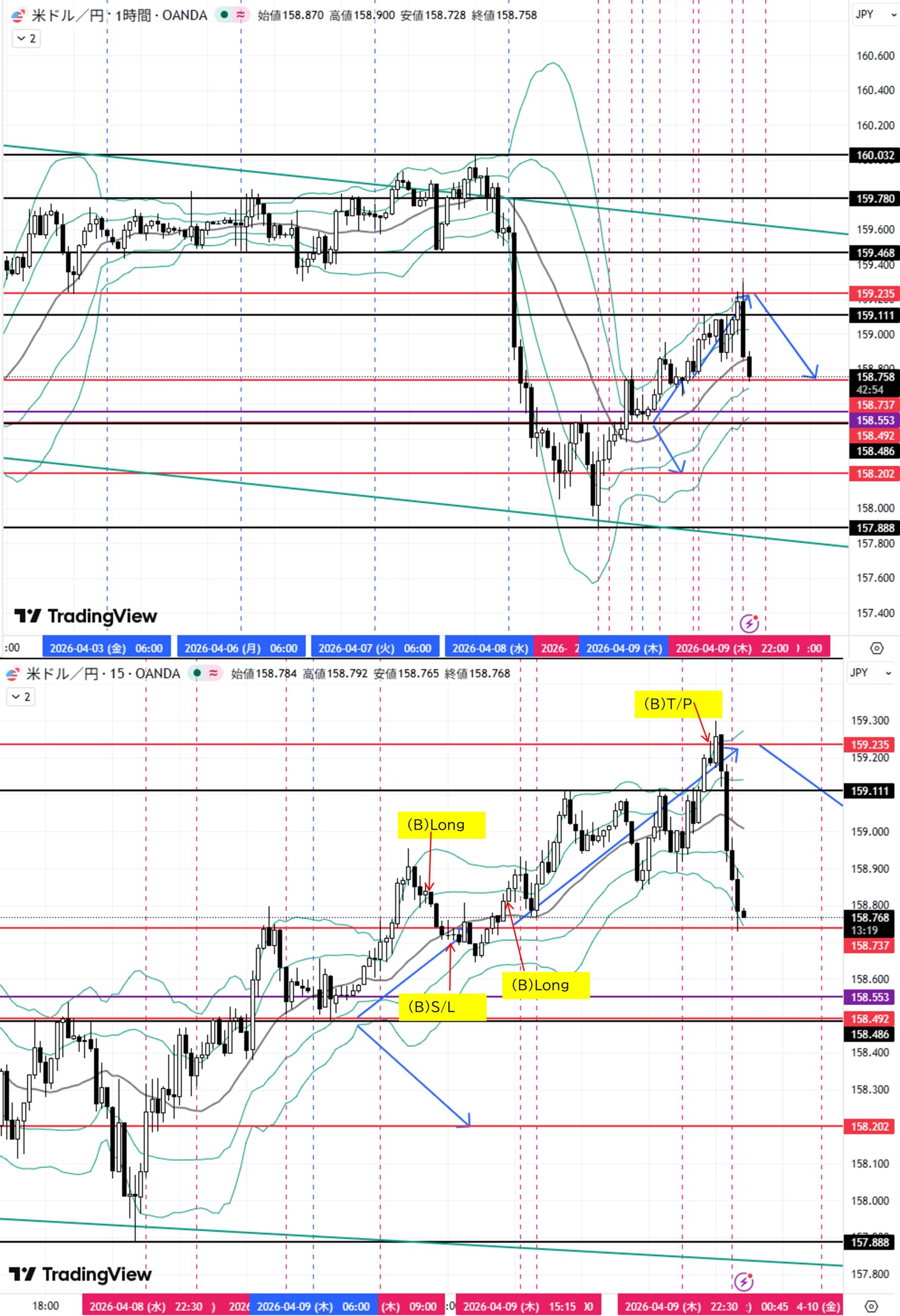 (B)1Hダウ足高値158.737をダウ上昇→目標4H足押し安値159.235