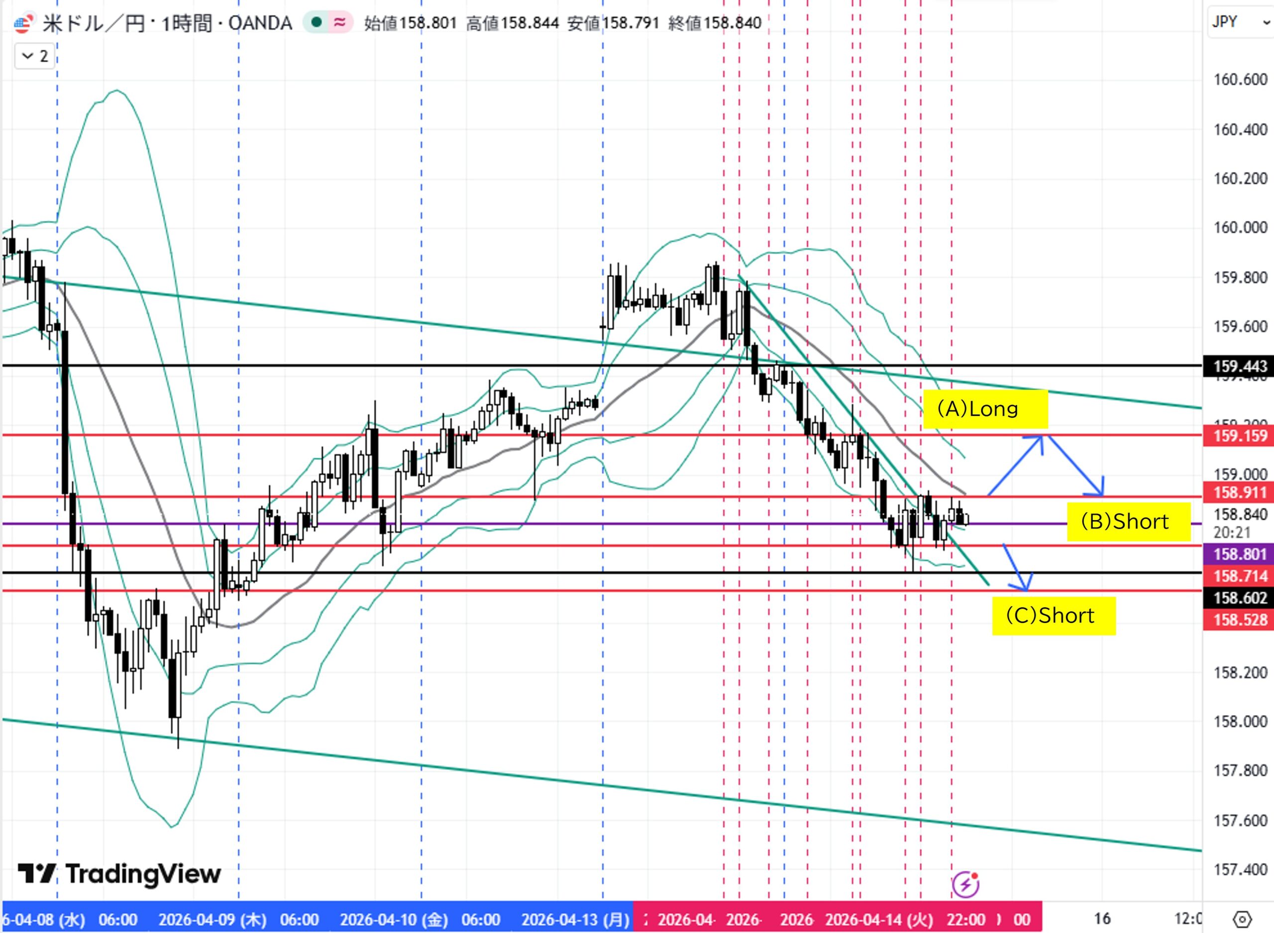 (C)1H足レンジ安値158.714をダウ下落→目標1H足押し安値158.528