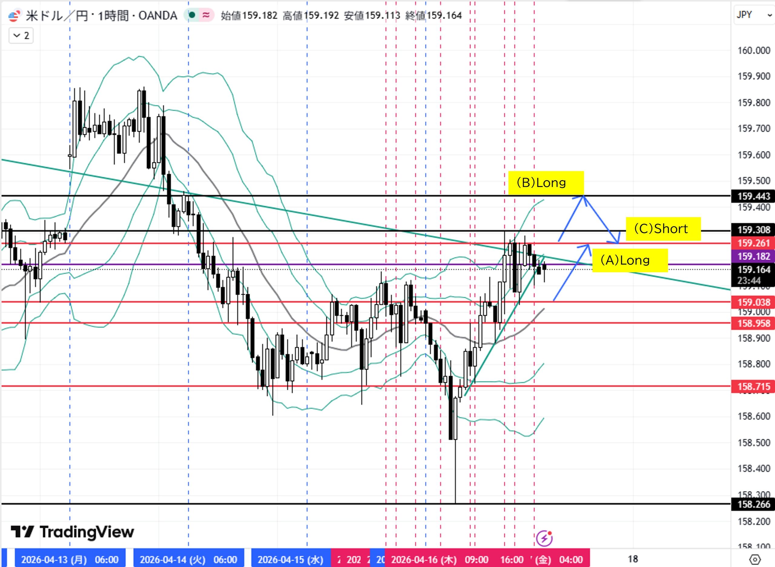 (A)1H足ダウ高値159.038付近へ下落→転換上昇→目標1H足レンジ高値159.261